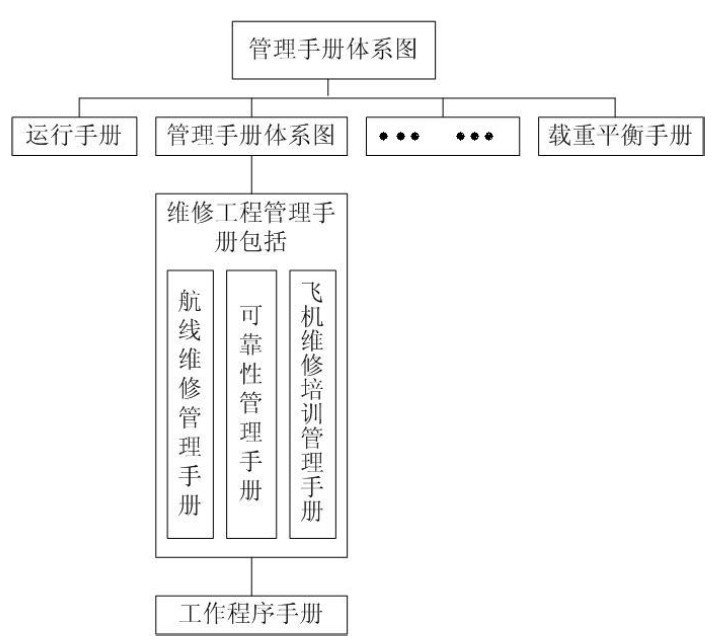 《運(yùn)行手冊》含《特殊運(yùn)行手冊》;《維修工程管理手冊》含《航線維修管理手冊》、《可靠性管理手冊》、《飛機(jī)維修培訓(xùn)管理手冊》;與《應(yīng)急處置程序手冊》、《機(jī)組應(yīng)急程序手冊》、《航空安全保衛(wèi)手冊》、《飛行技術(shù)訓(xùn)練管理手冊》、《危險品運(yùn)輸手冊》、《機(jī)上危險品事故處理指南》、《載重平衡手冊》等構(gòu)成公司運(yùn)行的手冊體系。對于相對具有獨(dú)立性的航線維修及其管理、人員培訓(xùn)管理,單獨(dú)編寫《航線維修管理手冊》和《飛機(jī)維修培訓(xùn)管理手冊》作為分冊。針對《維修工程管理手冊》中涉及到工作程序的內(nèi)容,單獨(dú)編寫《工作程序手冊》。
