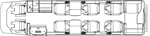 The standard floor plan provided with the Bombardier Learjet 40 XR business jet (龐巴迪利爾40XR公務(wù)機(jī)) offers a forward club-seating configuration that includes two 20-inch (51-cm) executive tables. Two forward-facing seats are positioned directly behind the club arrangement.