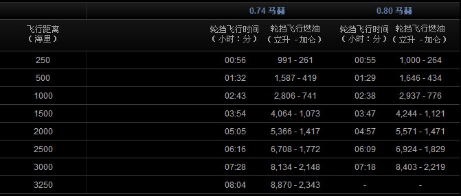 假設(shè)條件: A1E發(fā)動(dòng)機(jī); ISA; 無(wú)風(fēng)。 NBAA IFR 備份燃油: 8名乘客