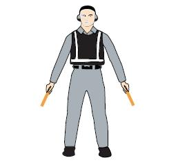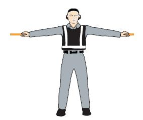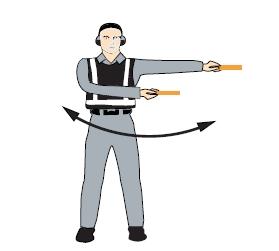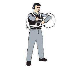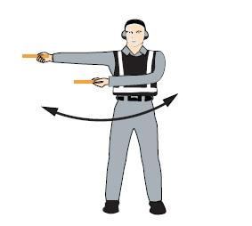 一臂水平指向左側(cè), 另一臂反復(fù)向所指方向揮動,示意直升機(jī)應(yīng)向右移動(轉(zhuǎn)向)向右移動(轉(zhuǎn)向)