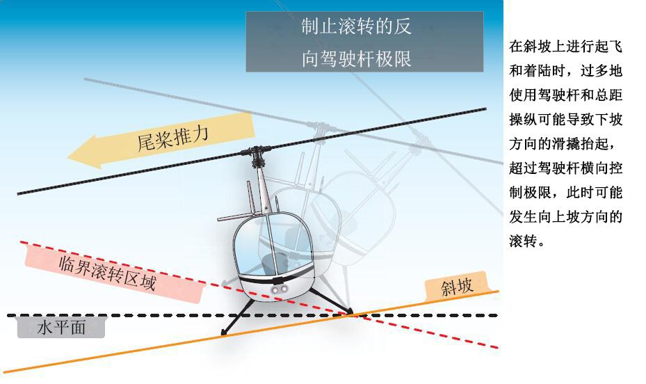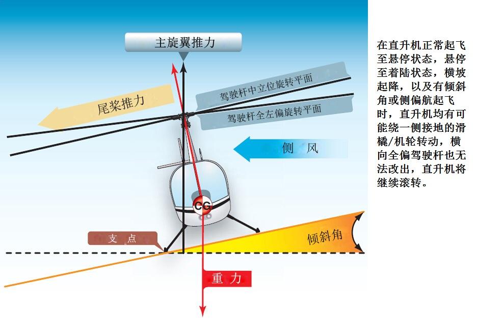 機(jī)輪位于地面時(shí)直升機(jī)出現(xiàn)漂移,那么該傾斜角或漂移會(huì)使直升機(jī)繞仍然接地的滑橇/機(jī)輪轉(zhuǎn)動(dòng)。當(dāng)這種情況發(fā)生時(shí),相比懸停的直升機(jī)而言,橫向操縱駕駛桿的反應(yīng)速度會(huì)更加緩慢,且效果較差。如果允許滾轉(zhuǎn)速率繼續(xù)增大,那么傾斜角將達(dá)到臨界值,即使全量橫向操縱駕駛桿也不能將滾轉(zhuǎn)改出,直升機(jī)將發(fā)生側(cè)翻,引起重大事故。隨著滾轉(zhuǎn)速率增大, 仍有可能改出的角度越來(lái)越小。臨界滾轉(zhuǎn)角也相應(yīng)減小,臨界滾轉(zhuǎn)角在下列情況下會(huì)進(jìn)一步減。河覀(cè)滑橇/機(jī)輪接地、 左側(cè)風(fēng)、橫向重心靠右、主旋翼拉力幾乎等于直升機(jī)重量以及抵左腳蹬。