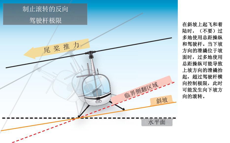 作程序,并注意保持較小的滾轉(zhuǎn)速率。駕駛員應(yīng)緩慢抬起下坡方向的滑橇/機(jī)輪,拉平直升機(jī),然后起飛;著陸時(shí),駕駛員應(yīng)先使一側(cè)(上坡方向的)滑橇/機(jī)輪接地,然后綜合使用駕駛桿和總距,緩慢放下下坡方向的滑橇/機(jī)輪。如果直升機(jī)向上坡方向傾斜約 5-8°,駕駛員應(yīng)減小總距以修正傾斜角,并使直升機(jī)回到水平姿態(tài),然后重新開(kāi)始著陸程序。(參見(jiàn)圖 5)