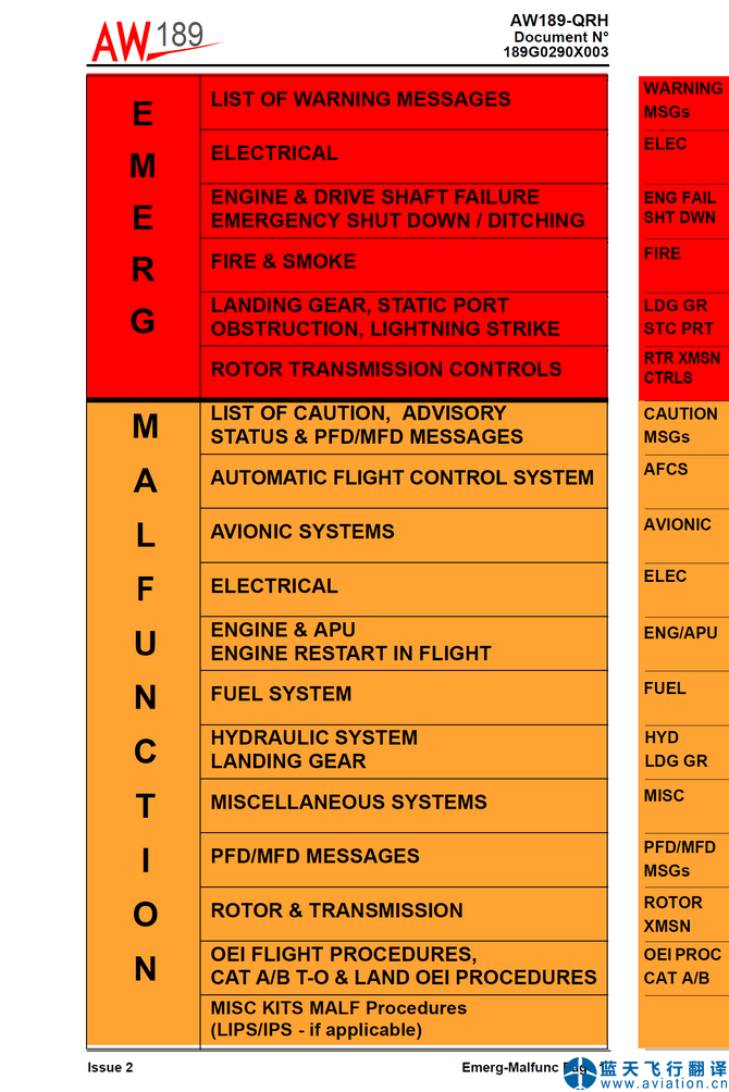 北京藍天飛行翻譯公司承接直升機公司AW189直升機快速檢查單翻譯任務 AW189 Quick Reference Handbook(QRH) Translation