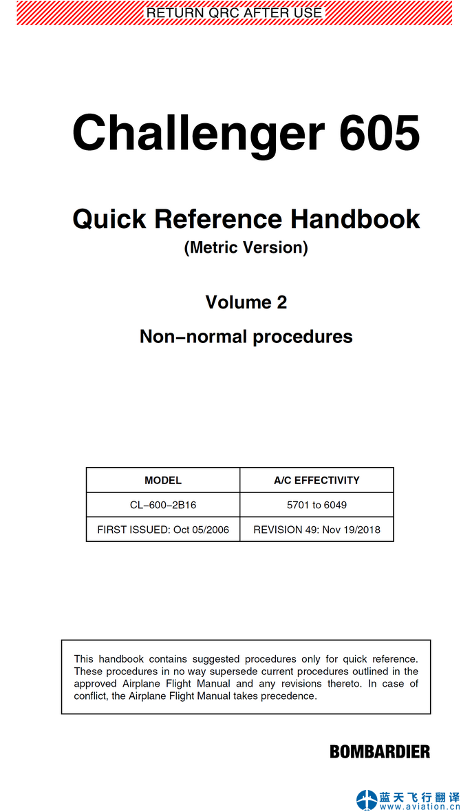 北京藍(lán)天飛行翻譯公司承接公務(wù)機(jī)公司2018年11月19日第49版龐巴迪挑戰(zhàn)者605快速檢查單翻譯任務(wù) REVISION 49: Nov 19/2018 Bombardier Challenger 605 Quick Reference Handbook Translation