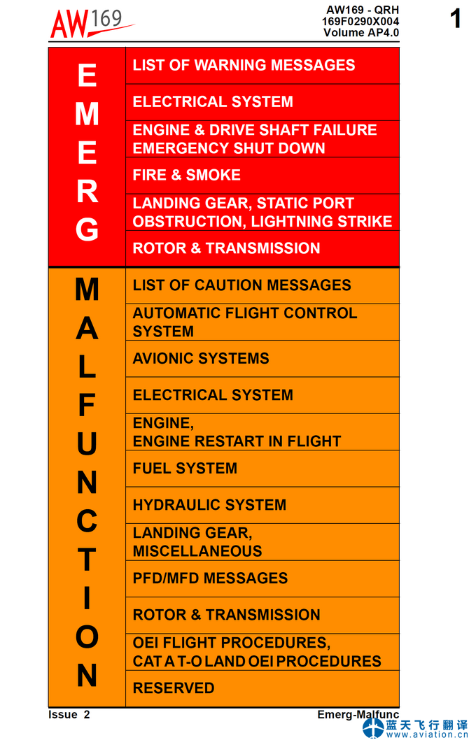 AW169直升機(jī)快速檢查單(Quick Reference Handbook(QRH))的主要內(nèi)容包含有: