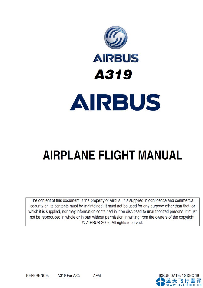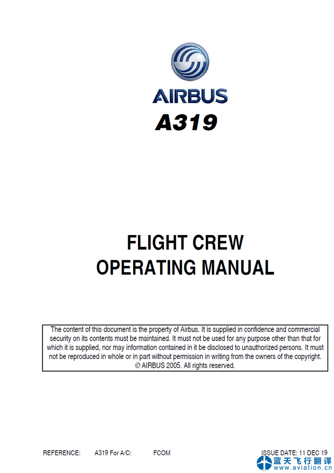 本次翻譯的ACJ319構(gòu)型為319-115,ACJ319飛行機組操作手冊和ACJ319快速檢查單修訂日期為2019年12月11日,ACJ319飛機飛行手冊修訂日期為2019年12月10日。
