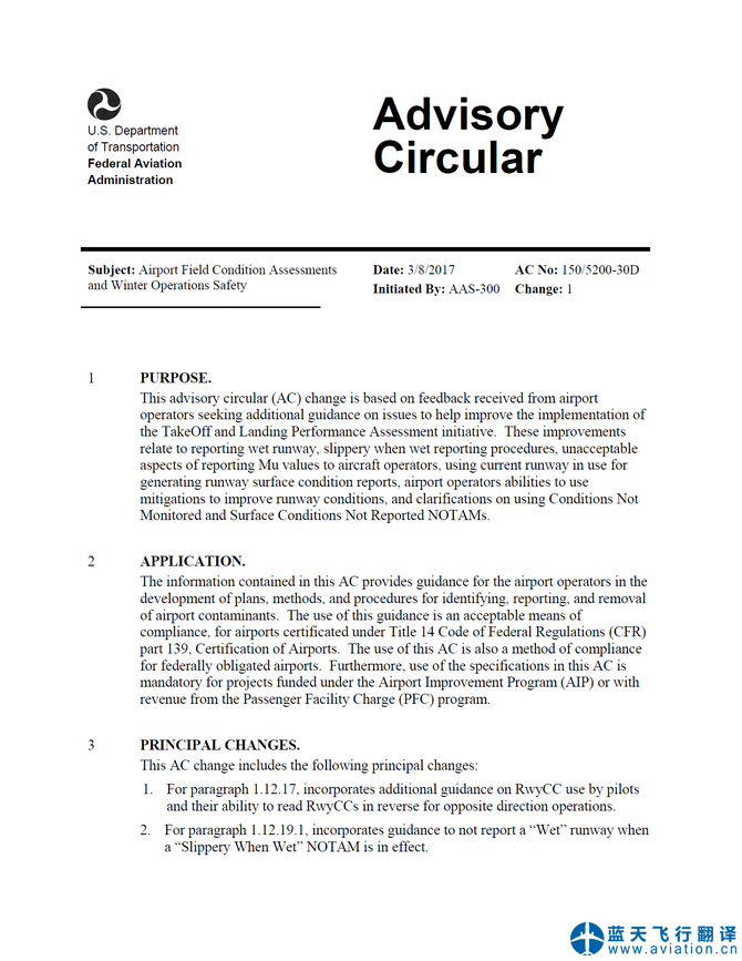 北京藍(lán)天飛行翻譯公司承接大型航校的FAA咨詢(xún)通告機(jī)場(chǎng)條件評(píng)估和冬季運(yùn)行安全翻譯任務(wù) FAA Advisory Circular Airport Field Condition Assessments and Winter Operations Safety Translation