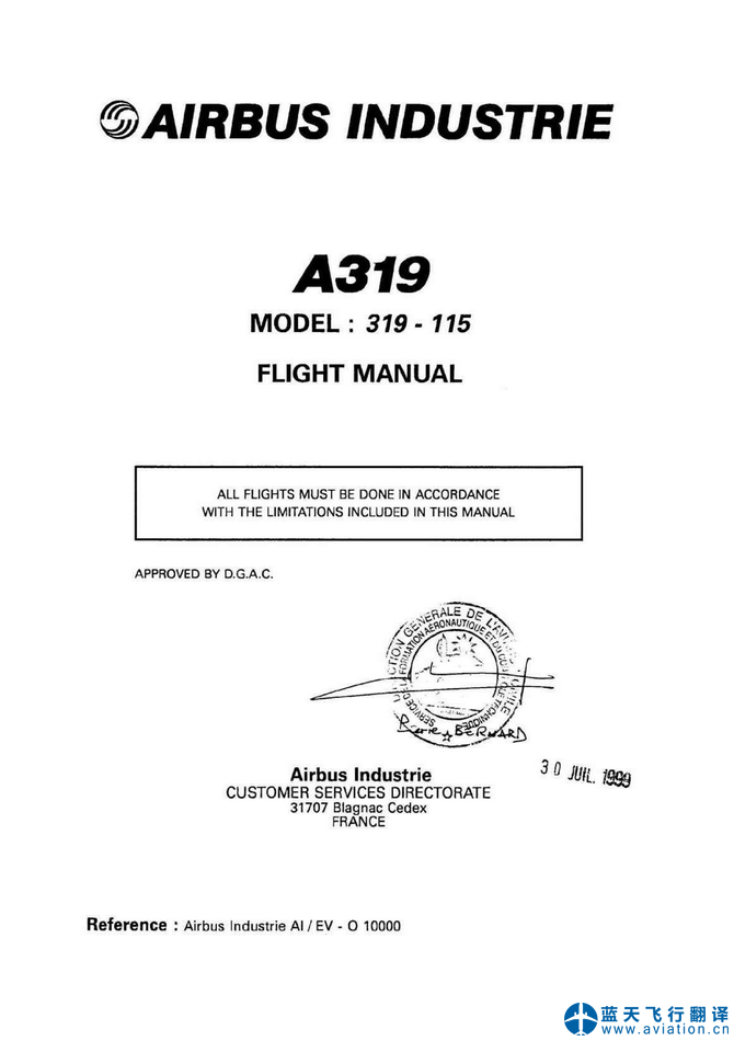 北京藍(lán)天飛行翻譯公司完成大型公務(wù)機(jī)公司的2020年3月4日版本空客公務(wù)機(jī)ACJ319飛行機(jī)組操作手冊(cè)(FCOM FLIGHT CREW OPERATING MANUAL)、ACJ319快速檢查單(QRH QUICK REFERENCE HANDBOOK)和ACJ319飛機(jī)飛行手冊(cè)(AIRPLANE FLIGHT MANUAL)翻譯任務(wù) 04 MAR 20 ACJ319 FLIGHT CREW OPERATING MANUAL, QRH QUICK REFERENCE HANDBOOK and AIRPLANE FLIGHT MANUAL Translation