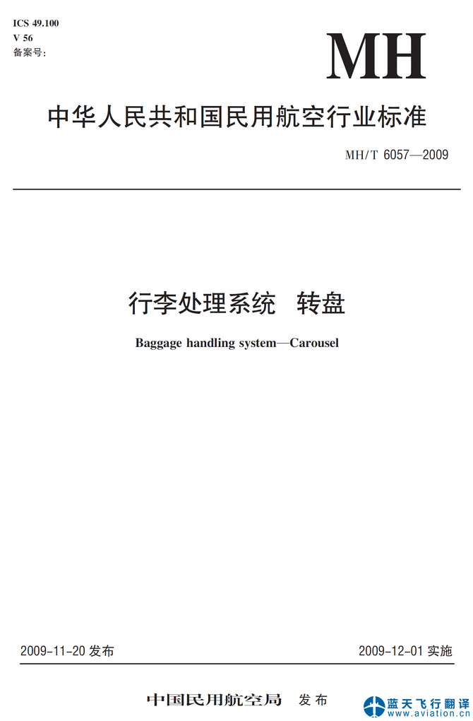 北京藍(lán)天飛行翻譯公司承接中國(guó)民用航空局發(fā)布的中華人民共和國(guó)民用航空行業(yè)標(biāo)準(zhǔn)行李處理系統(tǒng)轉(zhuǎn)盤翻譯任務(wù) Baggage handling system—Carousel, Civil Aviation Industrial Standard Translation![]() 中華人民共和國(guó)民用航空行業(yè)標(biāo)準(zhǔn)行李處理系統(tǒng)轉(zhuǎn)盤 中華人民共和國(guó)民用航空行業(yè)標(biāo)準(zhǔn)行李處理系統(tǒng)轉(zhuǎn)盤(Baggage handling system—Carousel)的主要內(nèi)容包含有: