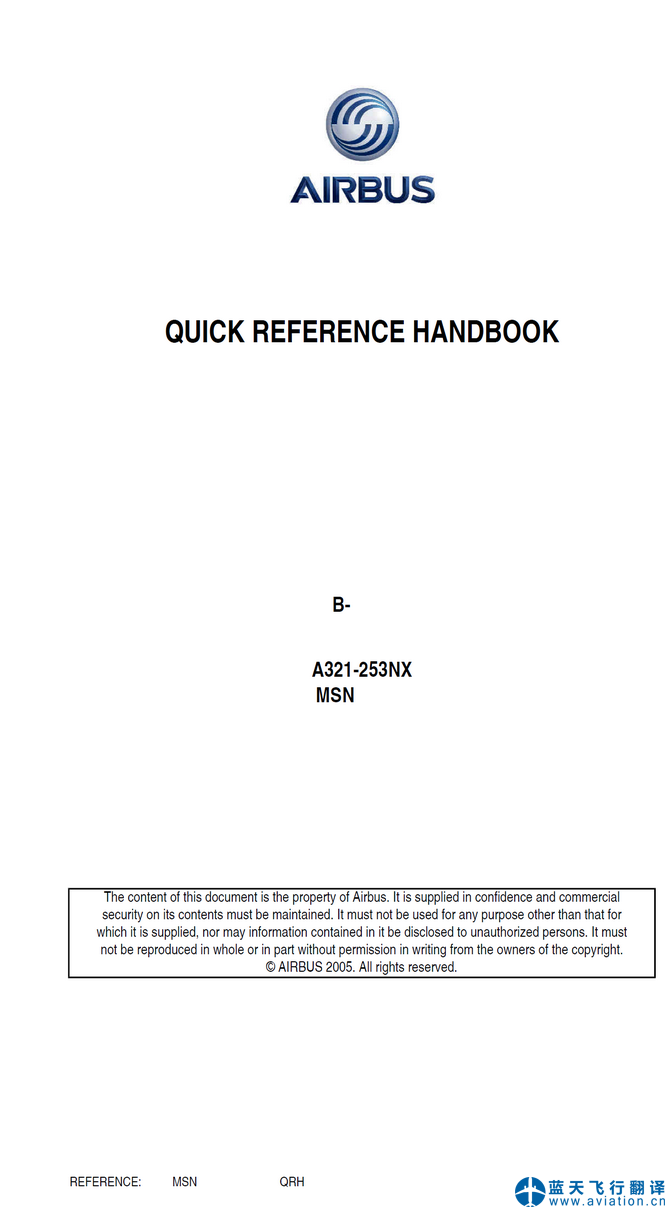 北京藍(lán)天飛行翻譯有限公司本次翻譯的空客A320系列快速檢查單(QUICK REFERENCE HANDBOOK)總共包含105架飛機(jī),機(jī)型包含有320-214、320-251N、321-253NX。