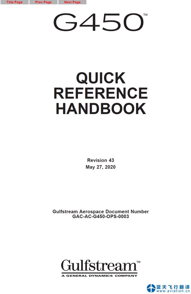 北京藍天飛行翻譯公司完成大型公務(wù)機公司的2020年5月27日版本灣流G450快速檢查單翻譯任務(wù) Revision 43 May 27, 2020 G450 QUICK REFERENCE HANDBOOK Translation