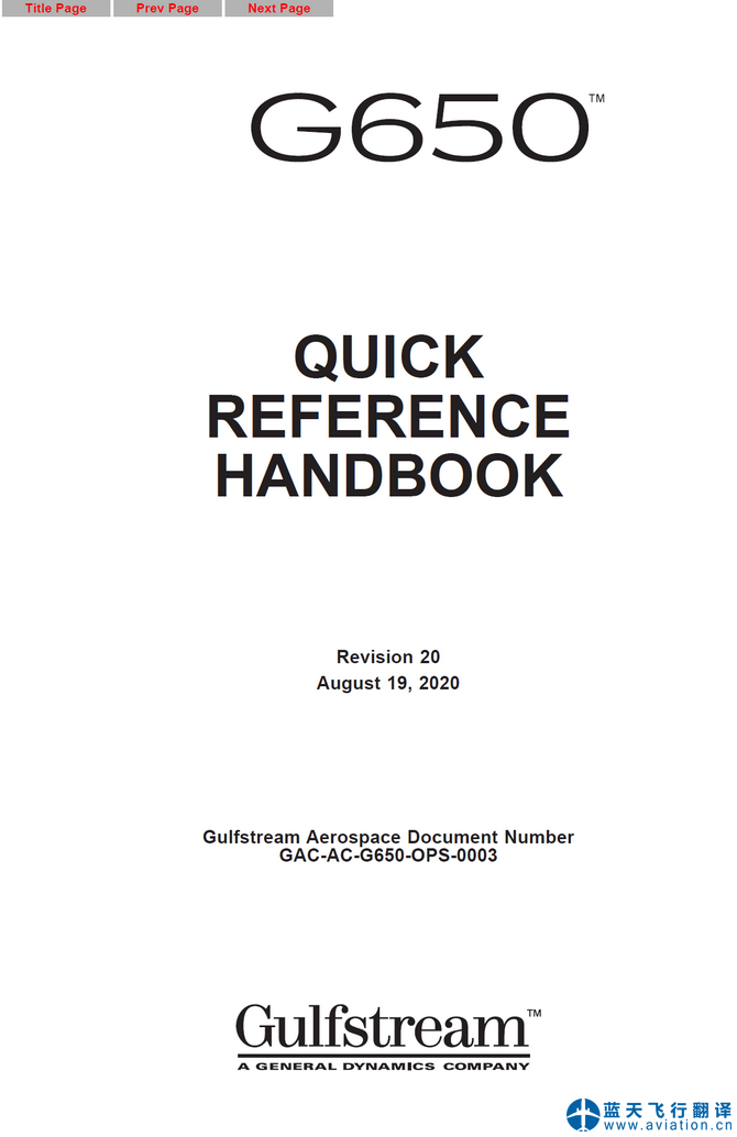 北京藍(lán)天飛行翻譯公司完成大型公務(wù)機(jī)公司的2020年8月19日版本灣流G650快速檢查單翻譯任務(wù) Revision 20 August 19, 2020 G650 QUICK REFERENCE HANDBOOK Translation