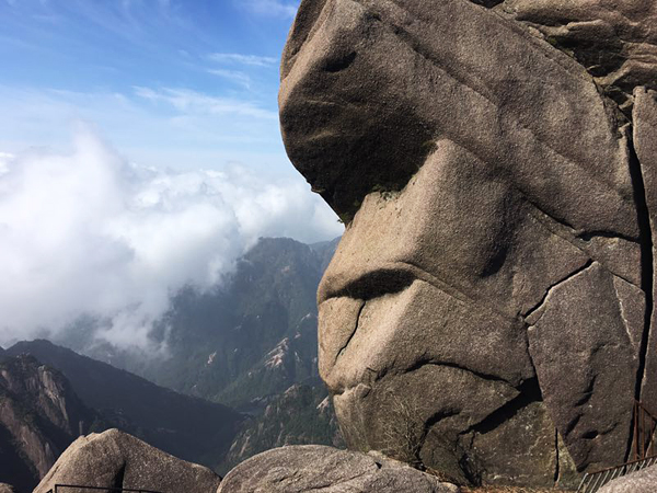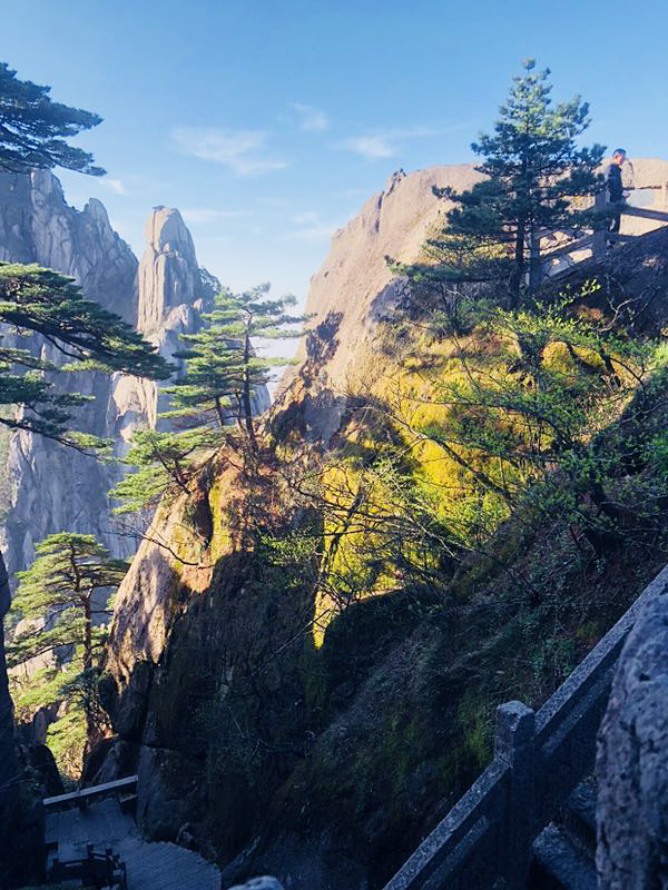 下了纜車我們就開始了階梯式的爬山,歷經(jīng)1個小時終于到達(dá)了迎客松,黃山的代表,這里有著像大猩猩的怪石、奇美的松樹。從高處眺望,一覽眾山小的感覺油然而生。