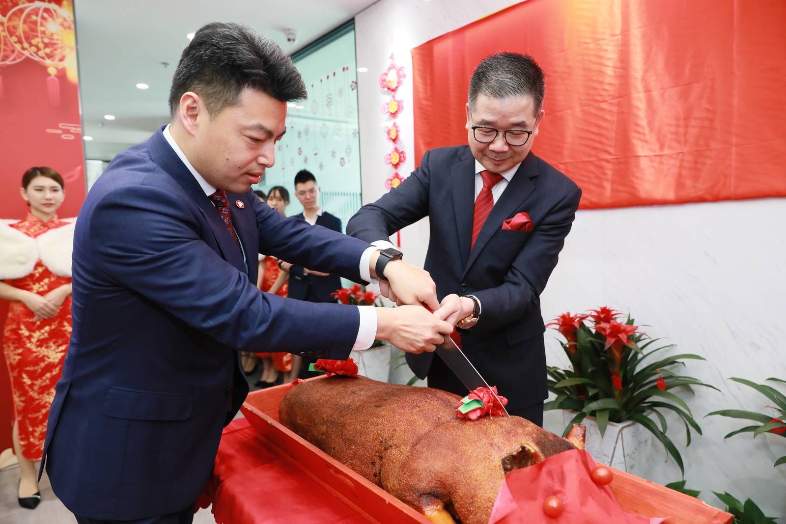 張海亮先生共切象征吉祥如意的烤乳豬,寓意紅紅火火,財(cái)源廣進(jìn)