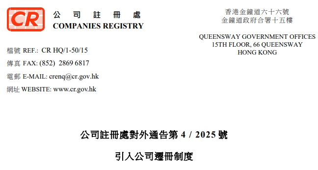 《公司條例》(第622章)已作出修訂,引入新的公司遷冊(cè)制度,讓非香港法團(tuán)遷冊(cè)來(lái)港。在《2025年公司(修訂)(第2號(hào))條例》(下稱《修訂條例》)內(nèi)的相關(guān)法例修訂,已于2025年5月23日實(shí)施。