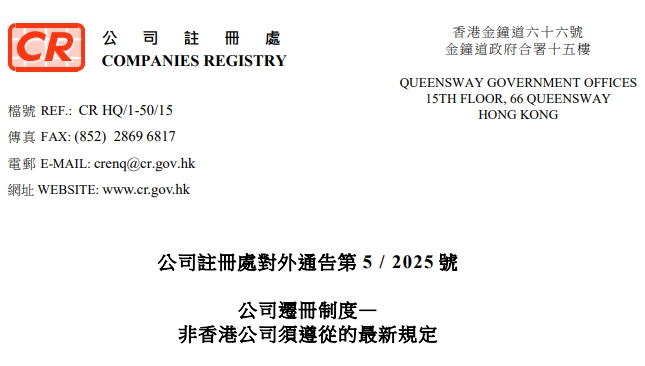 《公司條例》(第622章)(下稱「該條例」)已于2025年5月23日作出修訂,相關(guān)的《2025年公司(修訂)(第2號(hào))條例》除引入新的公司遷冊(cè)制度外,亦更新了根據(jù)該條例第16部注冊(cè)或?qū)⒂枳?cè)的非香港公司須遵從的規(guī)定。