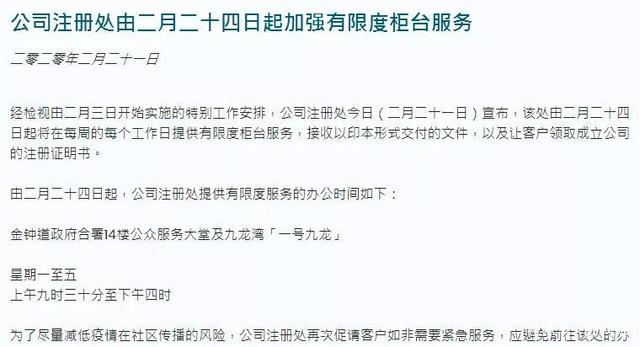 香港公司注冊處發(fā)布新聞公報(bào)宣布,由2月24日起繼續(xù)提供有限度柜臺服務(wù);僅接受影印文件提交,及辦理客戶領(lǐng)取成立公司注冊證明書 。