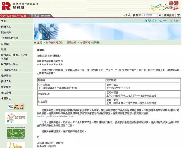 香港特區(qū)政府稅務(wù)局宣布由2月24日起,除商業(yè)登記署、印花稅署、中央詢問處外,仍暫停提供其他服務(wù)。