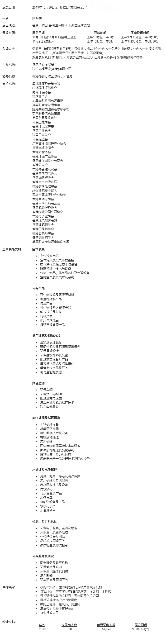 國際環(huán)保博覽是亞洲環(huán)保行業(yè)的優(yōu)質(zhì)商貿(mào)平臺,展示最新的環(huán)保產(chǎn)品、設(shè)備和先進(jìn)技術(shù)。博覽由香港特區(qū)政府環(huán)境局協(xié)辦,通過香港、中國內(nèi)地及國際政府部門和行業(yè)商會的鼎力支持,為環(huán)保行業(yè)提供企業(yè)對政府(B2G)和企業(yè)對企業(yè)(B2B)層面的商機(jī)。