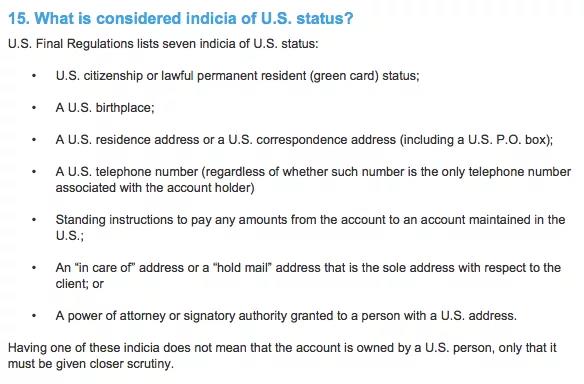 特別提醒:如果你只擁有其中一項(xiàng)標(biāo)記,并不意味著你的賬戶符合“美國(guó)人身份”,但會(huì)提醒國(guó)稅局必須給予更仔細(xì)的審查。一旦你的賬戶符合FATCA認(rèn)定的“美國(guó)人身份”,無(wú)論是在中國(guó)、英國(guó)、法國(guó),都可能都將逃不出美國(guó)稅務(wù)局(IRS)的監(jiān)控范圍。
