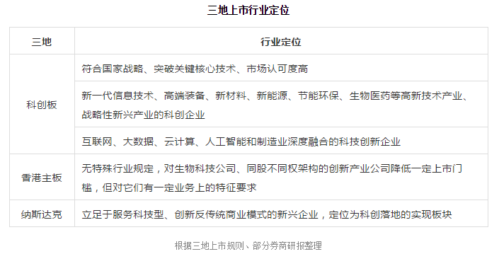 企業(yè)在選擇上市地點(diǎn)時(shí),是否符合當(dāng)?shù)厥袌?chǎng)的上市條件是頭等大事。這當(dāng)中,如果以行業(yè)來分,生物醫(yī)藥科技企業(yè)較為特殊。由于港股市場(chǎng)對(duì)于其上市的門檻做出特殊降低處理,因此上述資深人士建議還未盈利的生物醫(yī)藥研發(fā)類企業(yè)可以優(yōu)先考慮香港市場(chǎng),因?yàn)榭苿?chuàng)板對(duì)于非盈利企業(yè)的市值要求較高。