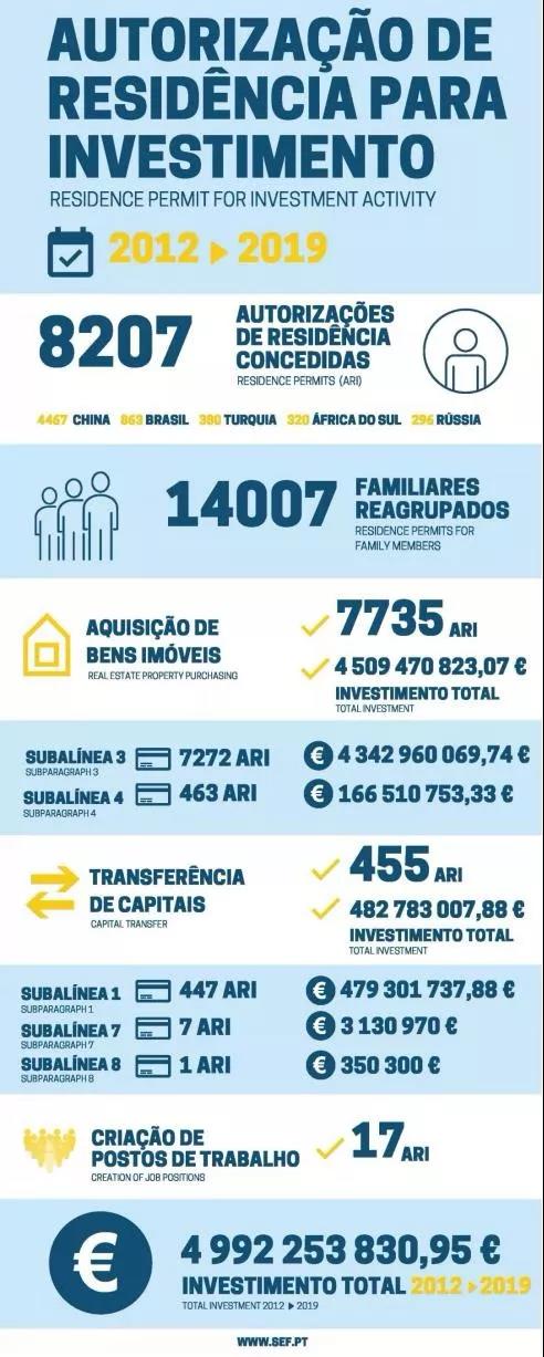 根據(jù)葡萄牙移民局(SEF)近期公布的2019年葡萄牙黃金居留許可數(shù)據(jù)顯示,自2012年10月8日葡萄牙黃金居留計劃推出至2019年12月31日,7年間,葡萄牙黃金居留許可項目吸引的總投資額達(dá)到49.9億歐元。其中房地產(chǎn)投資依舊是熱門之選,投資額達(dá)到45億歐元,占總投資額的90%。