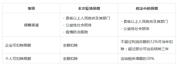為了企業(yè)和個(gè)人更好地制定所得稅稅收計(jì)劃,我們將本次疫情期間特殊捐贈(zèng)和稅法中的捐贈(zèng)對(duì)比列示如下供您參考: