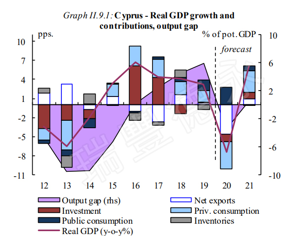 雖然COVID-19危機(jī)導(dǎo)致經(jīng)濟(jì)陷入衰退,數(shù)據(jù)顯示塞浦路斯2020年GDP預(yù)計(jì)將收縮7.5倍,但收縮情況明顯慢于歐洲總體情況,并預(yù)測在2021年GDP將反彈約6%。