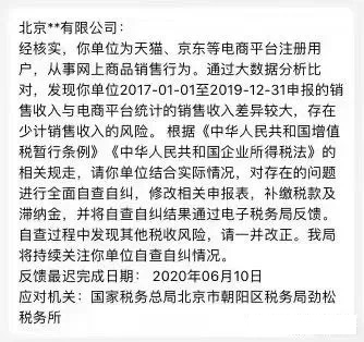 近日,多家經(jīng)營京東、淘寶/天貓網(wǎng)店的店主向媒體表示,在5月收到了當(dāng)?shù)囟悇?wù)局部門的“風(fēng)險(xiǎn)自查提示”,對(duì)他們存在的少記營業(yè)收入風(fēng)險(xiǎn)進(jìn)行提示,并要求自查從2017年至2019年存在的漏報(bào)問題并補(bǔ)繳稅款以及滯納金。