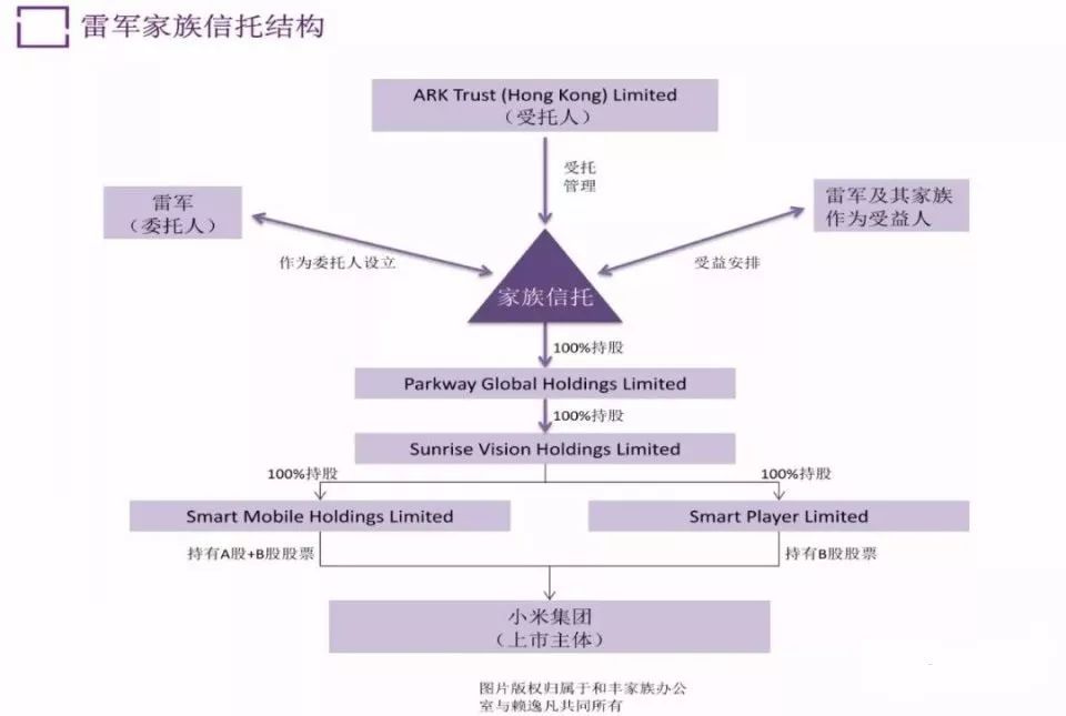 相比傳統(tǒng)的由銀行擔(dān)任信托受托人,雷軍設(shè)立的家族信托作為方舟信托的受托管理人,這是典型的上市前信托的架構(gòu)模型。