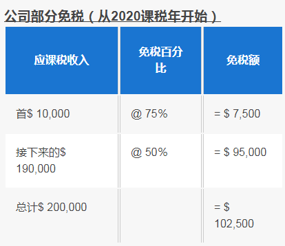 如下表所示,自2020課稅年開始,公司可享部分免稅,其力度為,應(yīng)課稅收入首個10000新元可獲得75%的免稅,免稅額為7500新幣;之后的190000額度的應(yīng)課稅收入可享受50%的免稅,免稅額為95000新幣。