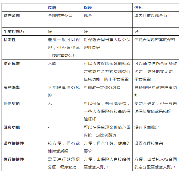 遺囑與保險(xiǎn)財(cái)富傳承工具的比較,為了體現(xiàn)保險(xiǎn)類似信托的功能,在下表中將加入信托的對比: