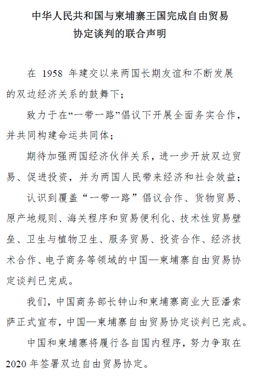 中國(guó)和柬埔寨7月20日共同發(fā)布《中華人民共和國(guó)與柬埔寨王國(guó)完成自由貿(mào)易協(xié)定談判的聯(lián)合聲明》,兩國(guó)將在2020年簽署雙邊自由貿(mào)易協(xié)定(FTA),自貿(mào)協(xié)議預(yù)計(jì)將從2021年1月1日起正式生效。中國(guó)自由貿(mào)易區(qū)“朋友圈”又添新成員!