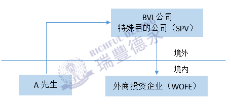 在返程投資架構(gòu)中,以上圖為例,A先生為中國內(nèi)地自然人,在BVI注冊了一家離岸公司,匯發(fā)[2014]37號文中將其稱之為“特殊目的公司”(SPV),A先生以BVI公司作為股東,回到中國投資注冊一家外商獨(dú)資企業(yè)(WOFE)。