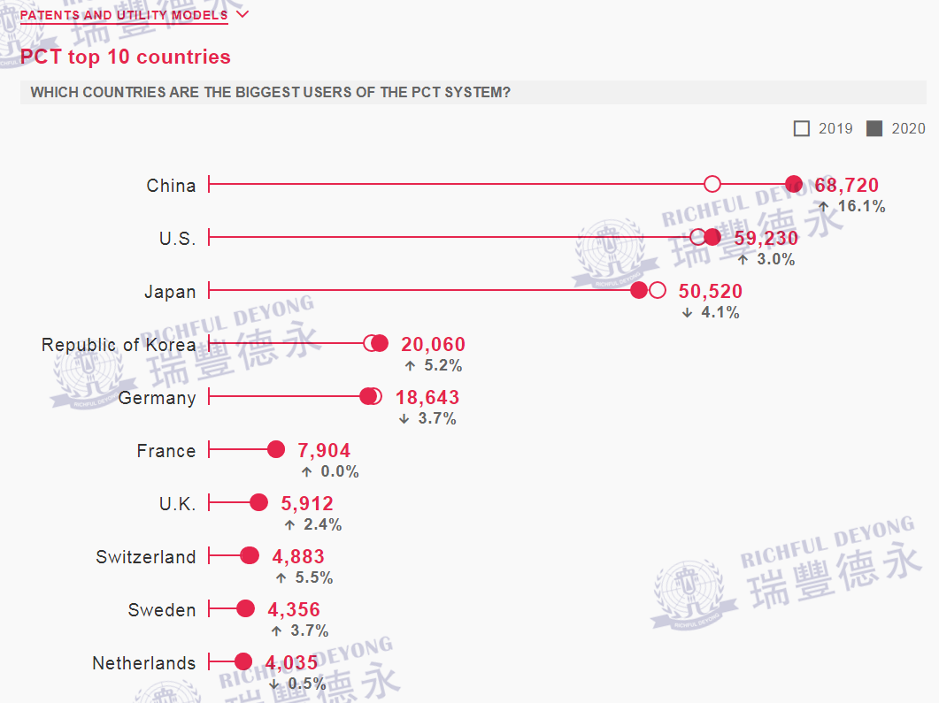 其中,來自中國的申請人提交的PCT申請量最多,達(dá)68,720件申請,同比增長16.1%,有史以來第一次超過美國成為PCT體系的年度最大用戶。中國,美國,日本,韓國和德國位列前五名。