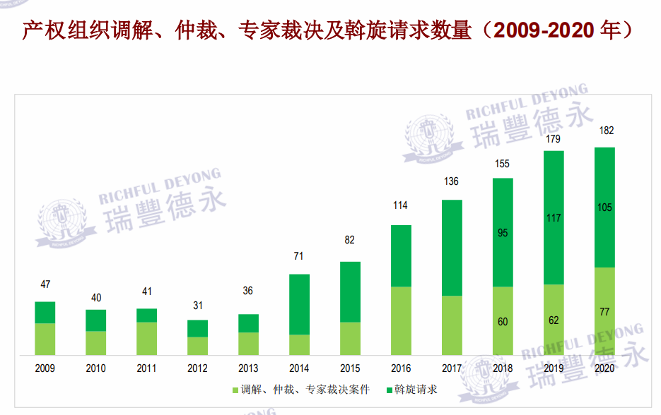 根據(jù)世界知識產(chǎn)權(quán)組織發(fā)布的最新數(shù)據(jù)顯示,自2013年以來,世界產(chǎn)權(quán)組織調(diào)解、仲裁、專家裁決及斡旋請求數(shù)量逐年增長,2020年創(chuàng)下新高一共182件,調(diào)解、仲裁、專家裁決案件77宗,斡旋請求105宗。