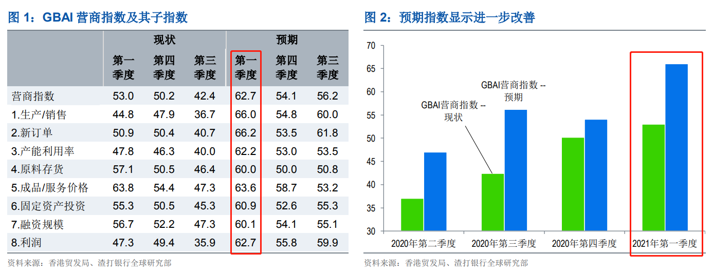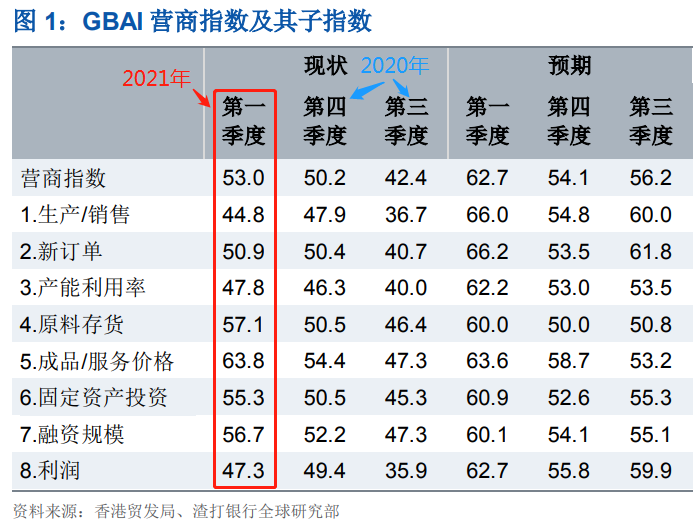 從指數看,GBAI 的經營活動的“現狀”指數從2020年第四季度的50.2連續(xù)第三個季度上升至2021年第一季度的53.0,高于中性值 50,代表2021年第一季度營商信心開局強勁。