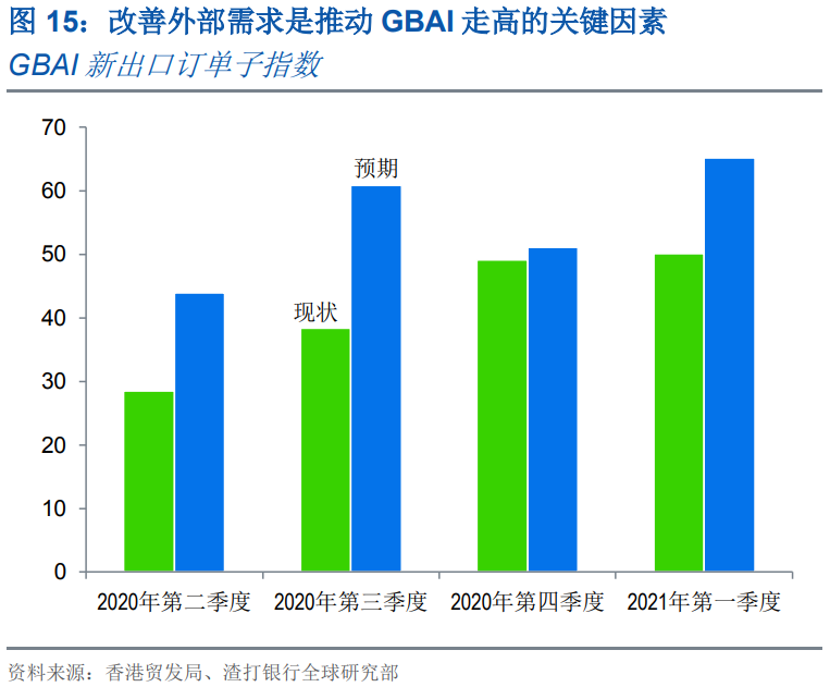 全球通貨再膨脹背景,尤其是在疫苗的迅速推廣以及美國即將出臺的新一輪財政刺激計劃的推動下,幫助提升新了企業(yè)出口訂單的前景,在國內強勁復蘇的同時,提振大灣區(qū)表現突出的制造業(yè)(圖 15)。