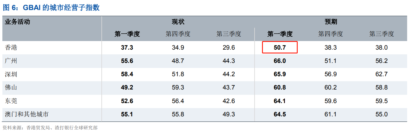 而香港終于表現出開始改善的跡象,盡管當前仍是大灣區(qū)表現較為落后,業(yè)務活動現狀指數連續(xù)第四個季度低 40,但其預期指數從之前的 38.3 躍升至 50.7,與經濟增長相一致。種種跡象表示,香港經濟正在復蘇。