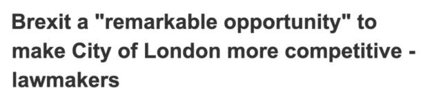 而英國路透社報(bào)道近日指出,“英國脫歐,將成為倫敦金融城更具競爭力的千載難逢機(jī)遇?!?span lang="EN-US">