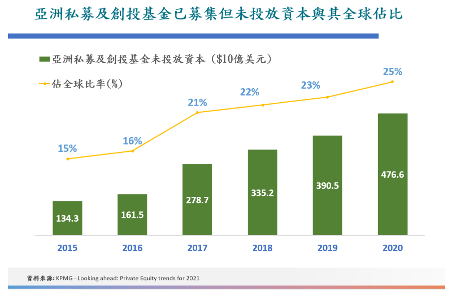 近期行業(yè)研究報(bào)告統(tǒng)計(jì)顯示,亞洲私募及創(chuàng)投基金已募集但未投放的資本(行業(yè)內(nèi)稱為Dry Powder)創(chuàng)下4,700億美元新高,占全球25%。以資產(chǎn)管理規(guī)模計(jì)算,香港目前已經(jīng)是亞洲區(qū)內(nèi)第二大私募基金市場(管理1,730億美元),僅次于內(nèi)地。