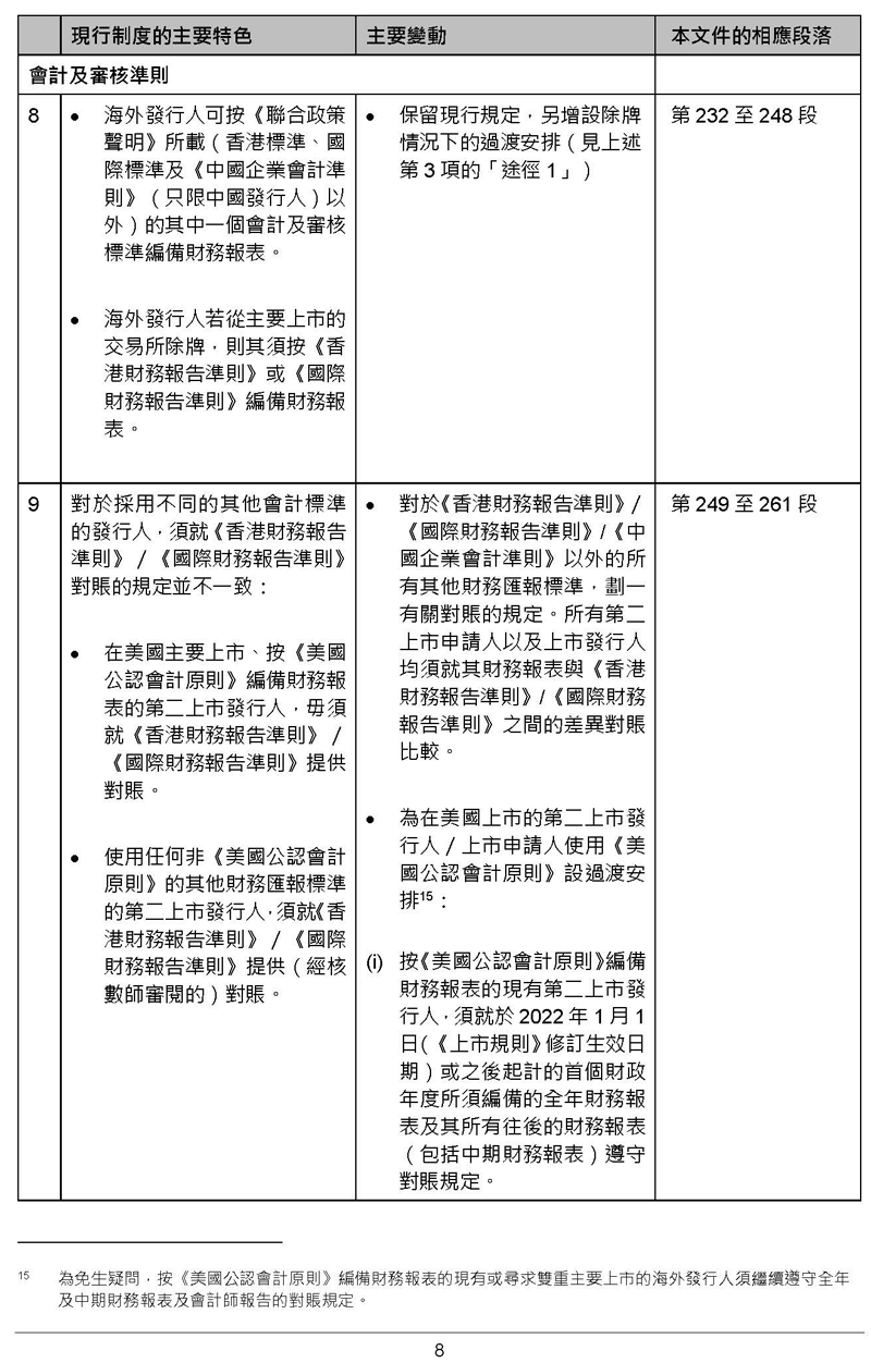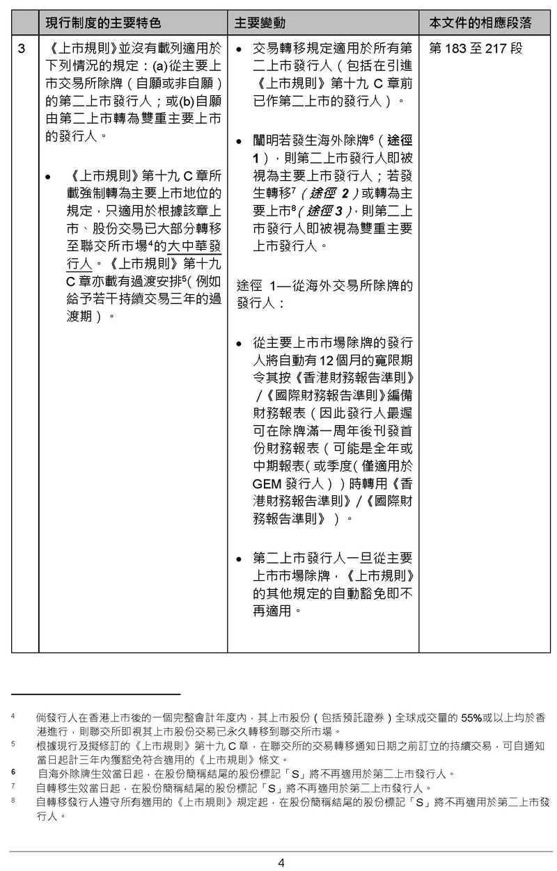 沒有不同投票權(quán)架構(gòu)的大中華發(fā)行人可作第二上市,而毋須證明其是“創(chuàng)新產(chǎn)業(yè)公司”,及上市時最低市值將改為30億元港幣(若能證明其在合資格交易所有至少五個完整會計年度的良好合規(guī)紀錄)或100億元港幣(若能證明其在合資格交易所有至少兩個完整會計年度的良好合規(guī)紀錄)。