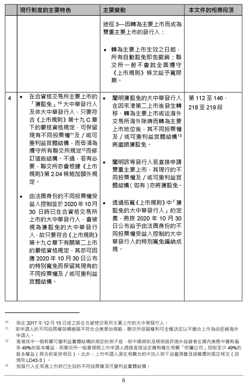 至于符合條件以既有WVR及可變利益實體(VIE)架構(gòu)、來港作第二上市的獲豁免大中華發(fā)行人及非大中華發(fā)行人,亦可保留現(xiàn)有架構(gòu),選擇在港進行雙重主要上市。發(fā)行人須至少在海外上市兩年、上市時市值至少400億元,或市值至少100億元而最近一個會計年度收益至少10億元。