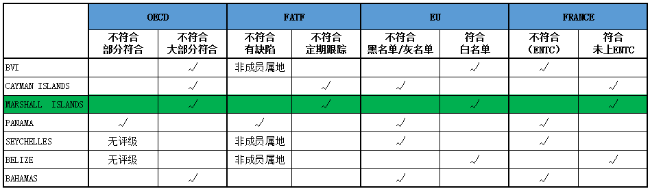目前,在國際上對于離岸屬地進行合規(guī)評級的主要有歐盟ECOFIN,國際經(jīng)合組織(OECD)以及反洗錢金融特別工作組(FATF)。而在國內(nèi)常見的離岸屬地中,同時加入各機構(gòu)評級又都在白名單上的海外屬地只有馬紹爾群島