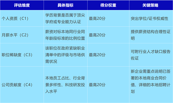所有薪資未達(dá)豁免標(biāo)準(zhǔn)者,必須在COMPASS框架的綜合評(píng)估(滿分100分)中累積至少40分。該模型從四個(gè)維度精準(zhǔn)量化申請(qǐng)人價(jià)值:
