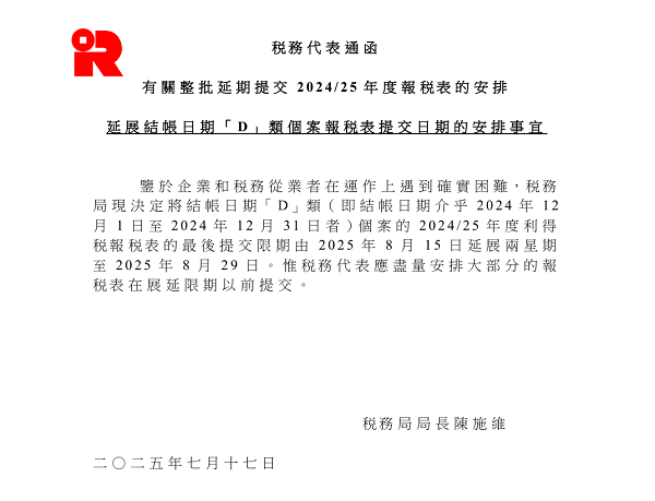 香港稅務(wù)局于2025年7月17日發(fā)布通告,鑒于企業(yè)與稅務(wù)服務(wù)機(jī)構(gòu)的年底結(jié)賬操作困難,正式延長(zhǎng)D類公司(財(cái)務(wù)年度結(jié)束于2024年12月1日-31日)的利得稅申報(bào)期限——由原定的2025年8月15日延后兩周至2025年8月29日。本次延期旨在緩解申報(bào)壓力,但需注意8月29日為最終截止日,逾期將面臨合規(guī)風(fēng)險(xiǎn)。