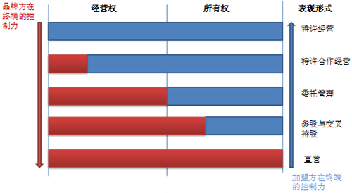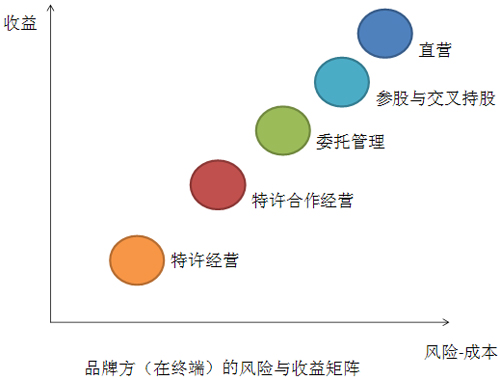 在這張圖里,我們大致可以看出品牌公司在對(duì)終端五種不同的方式控制路徑下,他們的風(fēng)險(xiǎn)-成本與收益的組合。連鎖公司經(jīng)營(yíng)的初期往往會(huì)注重終端的數(shù)量而非質(zhì)量,所以會(huì)選擇較小的收益與較低的風(fēng)險(xiǎn)-成本,當(dāng)終端“圈地”完成之后,重點(diǎn)則轉(zhuǎn)入單店的贏利能力和單店帶給公司的營(yíng)業(yè)收入。我們說(shuō)沒(méi)有一種愛(ài)情是最好的,不同的階段可能會(huì)欣賞不同的戀愛(ài)方式,品牌公司也是如此,最重要的還是要根據(jù)自己自身資源與能力,在公司戰(zhàn)略的指引下選擇一種或是幾種的連鎖組合。